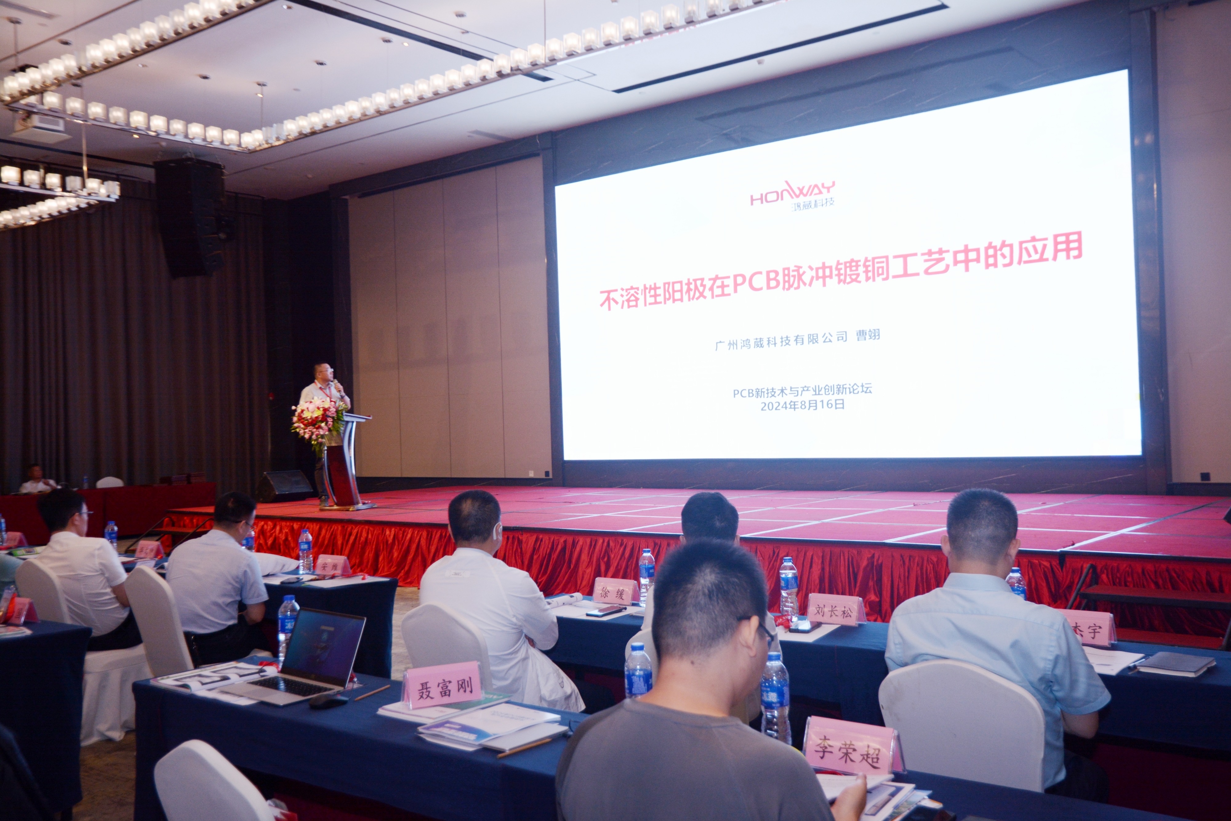 广州鸿葳科技有限公司总经理李勇、执行总经理刘德章、电极事业部总经理喻建国、总工程师曹翊博士、销售总监罗慧梅等受邀出席会议。会上,曹翊博士作了“不溶性阳极在PCB脉冲镀铜工艺中的应用”报告,分析鸿葳不溶性阳极在PCB脉冲镀铜工艺中的独特优势与应用潜力,吸引了在场专家与企业代表的热烈关注与讨论。