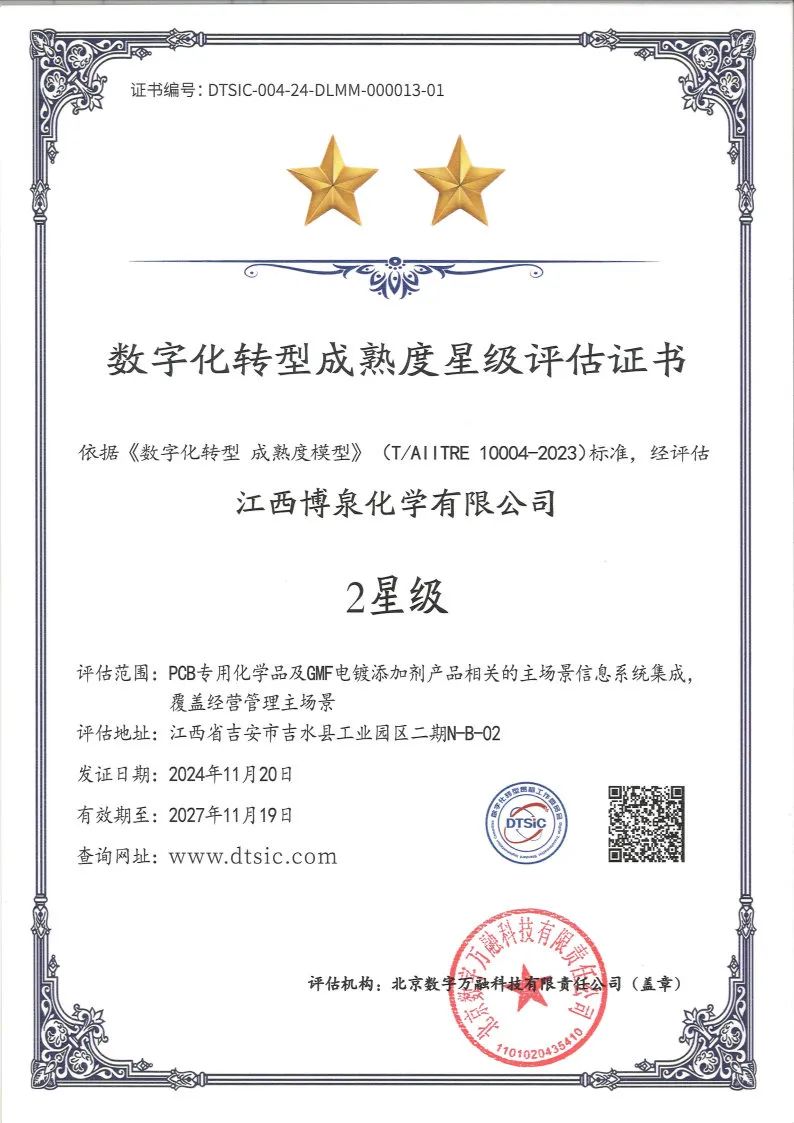 博泉化学积极探索数字化转型实施路径,持续提升数字化转型水平和核心竞争力。公司PCB专用化学品及GMF电镀添加剂产品相关的主场景信息系统集成成功通过数字化转型成熟度2星级评估,打造吉安数字化转型业务场景建设样板,为高质量发展注入新动能。