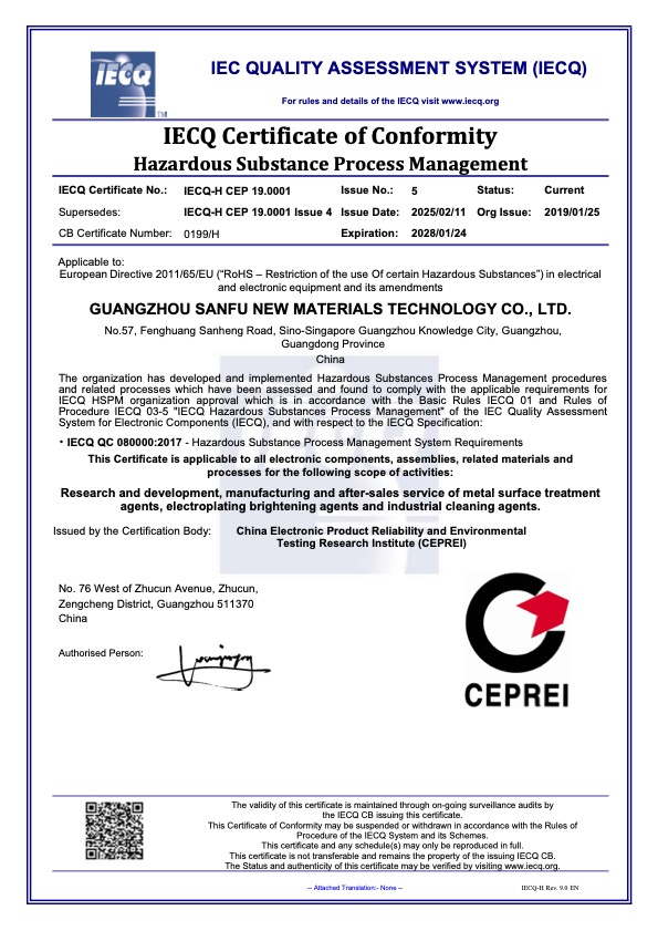 SF-Low Potassium Chloride Zinc Plating Additive recognized as a high-tech product of Guangdong Province in 2019